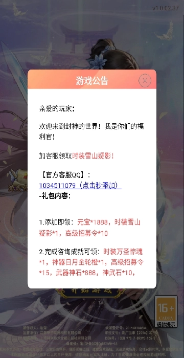 1、进入游戏后,你会瞧见游戏公告,加入他们的群能够获取诸多奖励。