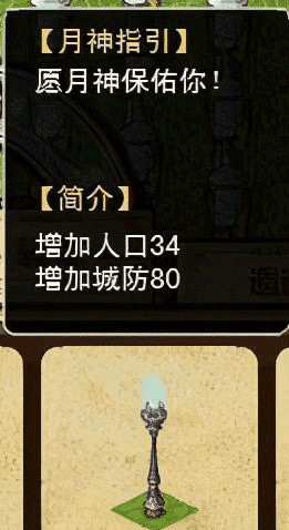 1、月神指引月神指引每格所增加人口为8.2城防为20