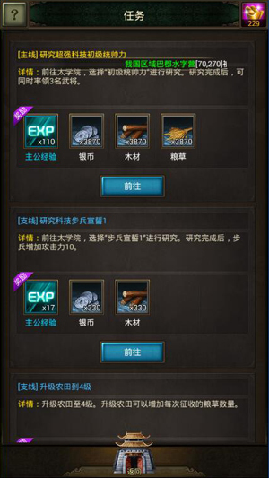 在太学院等级的研究中,会出现国器研究,这个主要是帮助武将提升战力所用,而国器图纸则可通过刷副本获得。图纸掉落的频率其实并不高,通常是比较耗费体力的,所以这便是各位主公在现阶段的重点工作安排。
