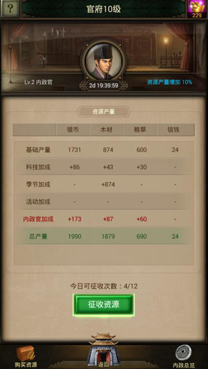 通关副本还会巧遇资源运输队充盈国库内存,除此之外还可获得额外建筑提升国内实力,甚至还能招募强力武将,增强军事战斗力。