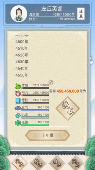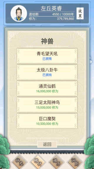 2、神兽部分:一个前期没用后期指着他活命的玩意。前期出了别管他,会有随机事件叫你帮忙,你帮忙之后会送你。中期随便养几只送的用来蹭点小修为,主要还是用来刷 人气和心态。到渡劫期之后迅速买金翅大鹏鸟,攒6400w升级成神兽之后去混天仙大会,一次70w+经验(这里每打一次都会掉1点人气,掉到七八十了就打几次地仙回上来就行)能不能第一世就狗到大乘全靠他了。大成之后把三足金乌买了,攒2亿5进化成凤凰,就可以愉快的混天仙会一二名了。