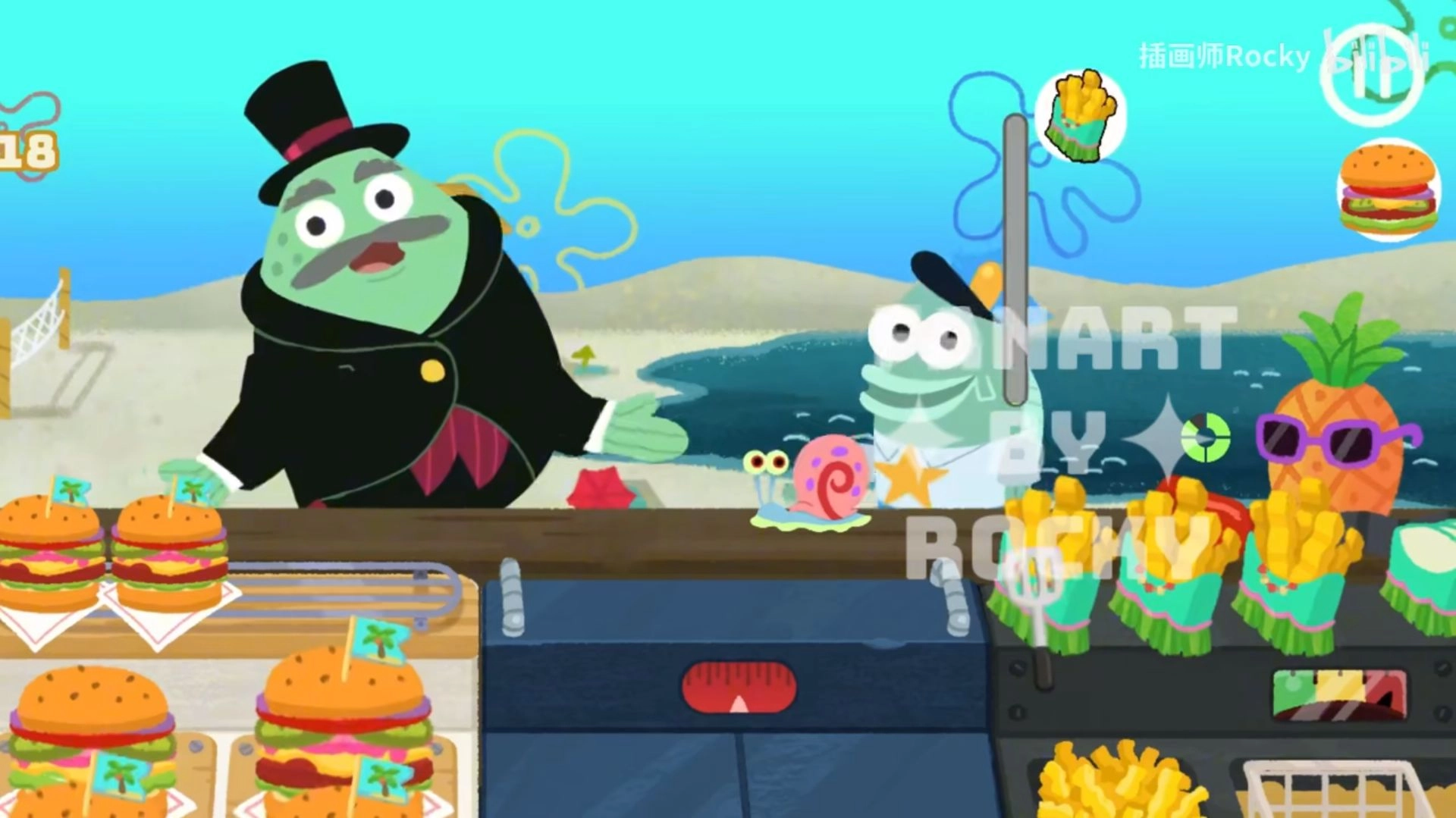 痞老板会来偷走你做好的蟹黄堡,多次点击痞老板可以夺回被抢走的蟹黄堡。