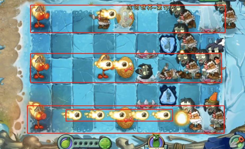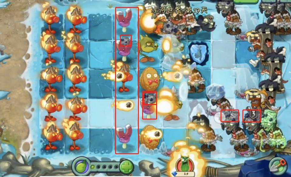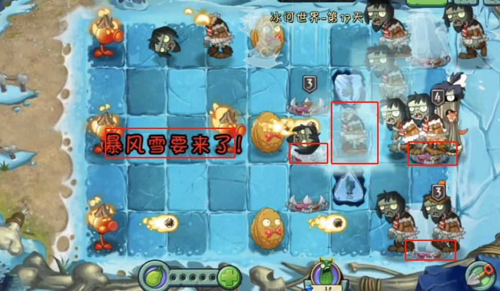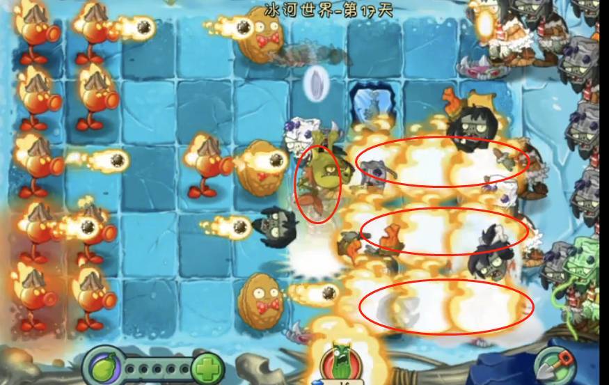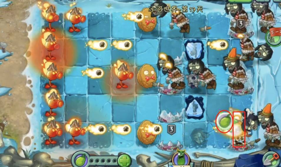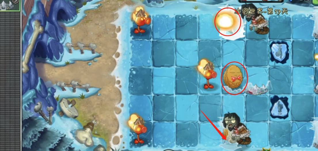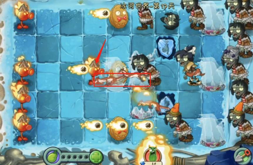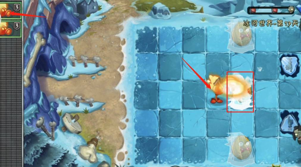 1、首先植物大战僵尸2冰河时代需要用关卡出的专属喷火豌豆尽可能解决被冰冻的坚果,坚果可以暂时抵挡住前几波的进攻,让玩家有时间攒更多的植物。