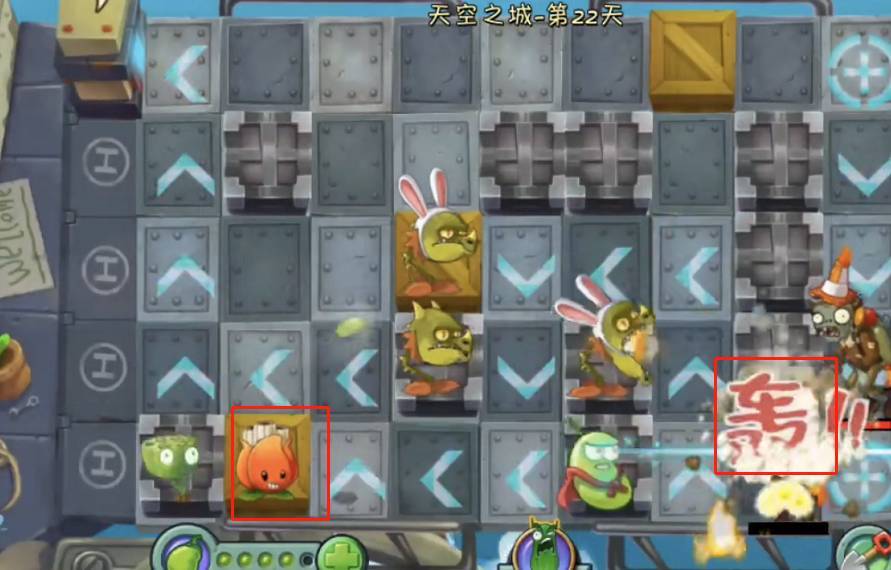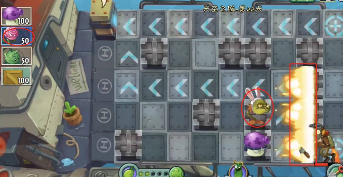 1、先说天空之城22关的简单打法。玩家开局要在第六列放置如图所示的第二种植物,接着对其升级,一直升级到喷火龙。这种植物能攻击三排僵尸,是前期和中期的过渡关键。升级成喷火龙后,再进一步升级为可轰炸的植物,如此便能在后方实现远距离输出。