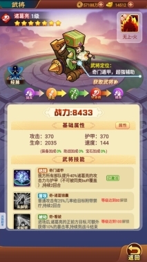 2、武将评价:诸葛亮拥有144的高速,其大招【奇门遁甲】能给全队带来增益效果,攻击和防御方面,对诸葛亮自身加40%,对庞统则减30% 。要知道,诸葛亮与庞统的初始攻击和初始防御均为370,这意味着,只要资源充足,庞统所减少的属性远不及诸葛亮增加的多,因此诸葛亮对庞统大招附带的debuff有着很强的克制作用。在游戏中,氪金大佬们的对手不乏将庞统和司马昭培养得极为出色的玩家。有时候,很难保证速度能绝对领先对方。此时带上诸葛亮,即便速度稍慢,在敌方庞统输出之后、核心输出爆发之前,也能确保己方队伍存活,并打出足额输出,强烈建议一定要带上诸葛亮!