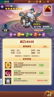 2、武将评价:于吉能为全队施加护盾并实现全队减伤,还能对敌方同列目标造成减速效果。其经脉可100%为相邻单位清除负面状态。当于吉处于2号位时,一、三、五位置的3个单位可直接免疫眩晕。只要于吉存活,孙权和荀彧就难有发挥空间,强烈建议队伍必带于吉!