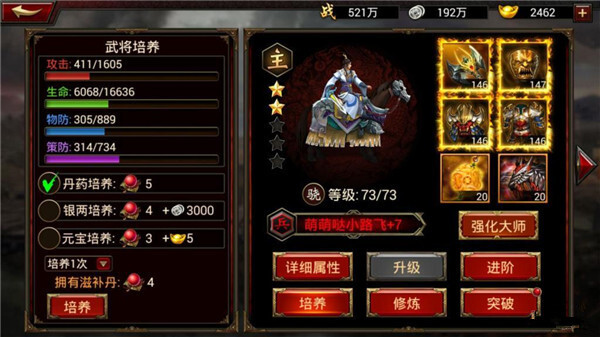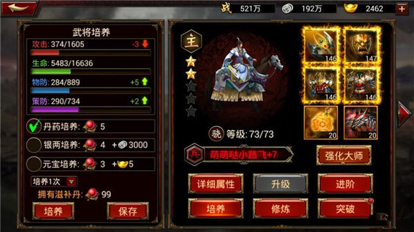 想必有人会疑惑,既然这种培养模式会浪费丹药,为何还要采用呢?实际上,在前期,这种培养方法是很有必要的。毕竟前期能获取的滋补丹数量极为有限,所以,通过最少的资源来提升更高的战力,不失为一种明智的选择。在此,给大家一个贴心提示,培养过程中,尽量别用银币和元宝。银币的话,大家都清楚,日常十分短缺。关键是武将重生后,额外投入的银币和元宝不会返还。哎,本宝宝前期就因为用元宝培养吃了大亏,呜呜呜。游戏嘛,还是循序渐进慢慢玩比较好。