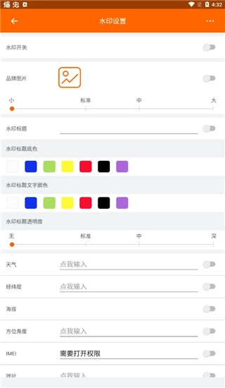 2、在“水印设置”中设置水印开关、天气、地点、经纬度、工程名称等等。