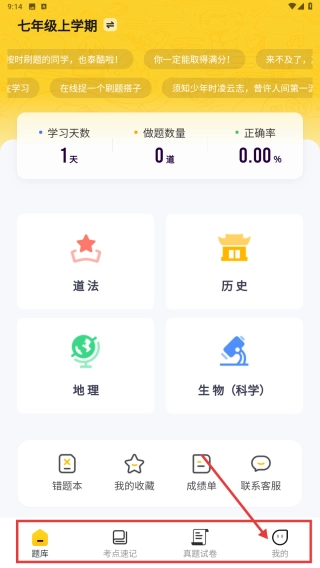 1. 在七年级上学期的学习主页页面,点击底部的“我的”选项,即可进入个人中心界面。
