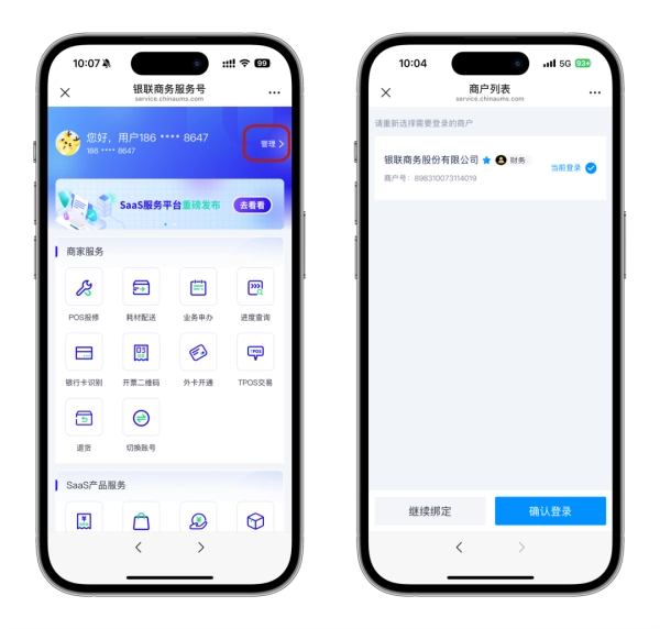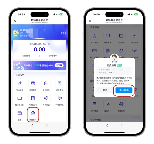 注意:解绑切换“银联商务服务号”中现有手机号后,将无法接收到此手机号下相关店铺的交易信息。退出登录后该手机号下绑定的商户信息不发生改变。