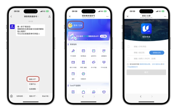 使用服务号内的部分功能,需要先进行用户注册/登录。未注册/未登录用户,请点击页面底端菜单栏“商户服务”-“服务大厅”,进入服务大厅可点击服务大厅上的“登录/注册”按钮或者点击“POS报修”、“耗材配送”、“业务申办”、“进度查询”、“开票二维码”中的任意一个,即跳转到注册/登录页面。填写手机号,获取验证码,填写验证码后,点击“提交”即完成注册及登录。