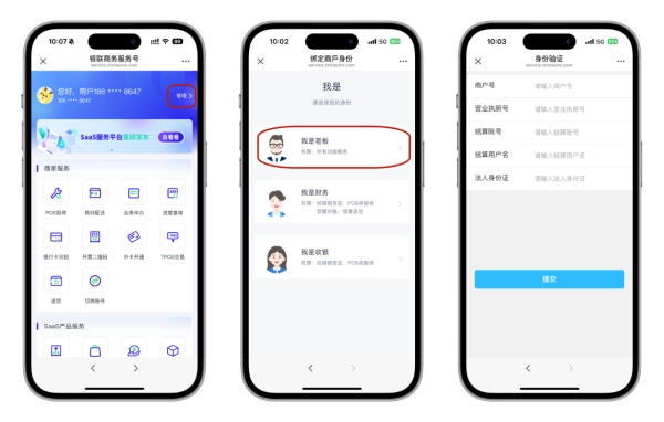 点击页面底端菜单栏“商户服务”-“服务大厅”,进入服务大厅可点击服务大厅上的“管理”按钮或者点击“POS报修”、“耗材配送”、“业务申办”、“进度查询”、“开票二维码”中的任意一个,均可以进入身份绑定界面,选择“我是老板”,输入商户号、营业执照号、结算账号、结算用户名、法人身份证,点击提交即可完成老板角色绑定。