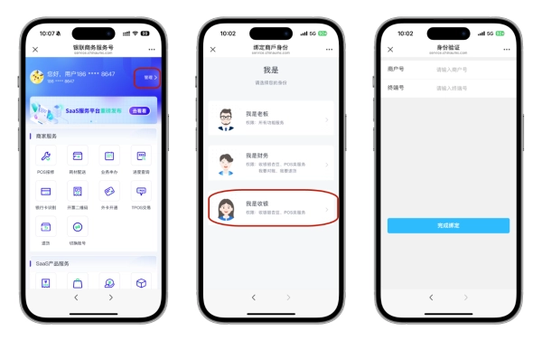 点击页面底端菜单栏“商户服务”-“服务大厅”,进入服务大厅可点击服务大厅上的“管理”按钮或者点击“POS报修”、“耗材配送”、“业务申办”、“进度查询”、“开票二维码”中的任意一个,均可以进入身份绑定界面,选择“我是收银员”,输入商户号和终端号即完成收银员角色绑定。