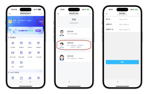 点击页面底端菜单栏“商户服务”-“服务大厅”,进入服务大厅可点击服务大厅上的“管理”按钮或者点击“POS报修”、“耗材配送”、“业务申办”、“进度查询”、“开票二维码”中的任意一个,均可以进入身份绑定界面,选择“我是财务”,输入商户号、结算账号、结算用户名,点击提交即可完成财务角色绑定。
