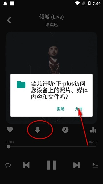 3、然后打开一首想要的歌曲播放界面,点,需要获取软件权限。