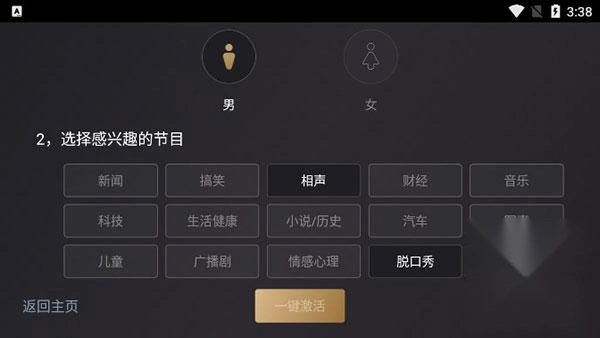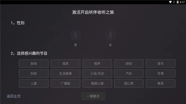 1、在魔趣网(m.mfunz.com)下载听伴FM车机版后,首次启动该应用时,需选择自己感兴趣的节目类型以及性别,以此完成一键激活操作。