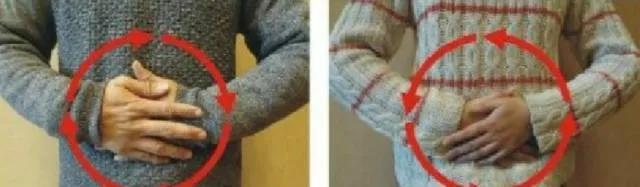 男左手在下,右手在上,双手心挨着肚脐,向下按着,顺时针揉。女右手在下,左手在上,逆时针按揉。